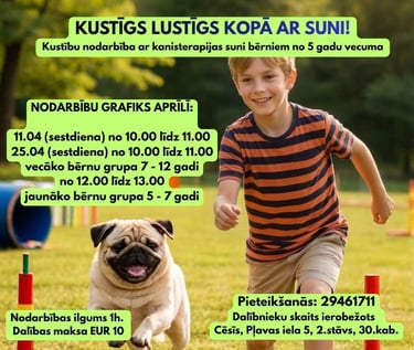 Kanisterapijas nodarbība ar pielāgotu saturu izglītības iestādēm, nometnēs un sociālās aprūpes centros