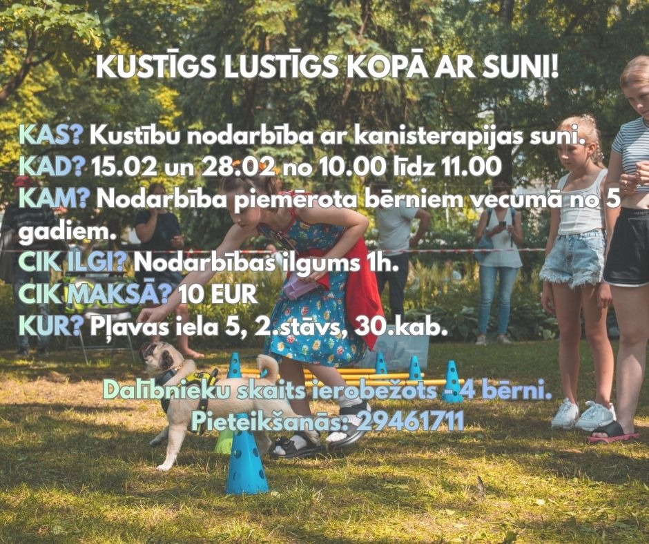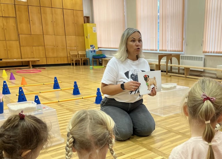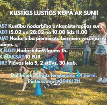 Kanisterapijas nodarbība ar pielāgotu saturu izglītības iestādēm, nometnēs un sociālās aprūpes centros